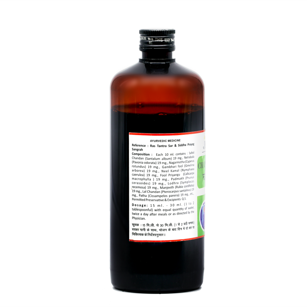 Each 10 ml. contains : Safed Chandan (Santalum album) 19 mg., Netrabala (Pavonia odorata) 19 mg., Nagarmotha (Cyperus rotundus) 19 mg., Gambhari fool (Gmelina arborea) 19 mg., Neel Kamal (Nymphaea caerulea ) 19 mg., Fool Priyangu (Callicarpa macrophylla ) 19 mg., Padmakh (Prunus cerasoides) 19 mg., Lodhra (Symplocos recemosa) 19 mg., Manjeeth (Rubia cordifolia) 19 mg., Lal Chandan (Pterocarpus santalinus) 19 mg., Patha (Cissampelos pareira) 19 mg., Chirayta (Swertia chirayata) 19 mg., Bad Ki chal (Ficus bengalensis) 19 mg., Pipal ki chal (Ficus religiosa) 19 mg., Kachur (Curcuma zedoaria) 19 mg., Pittpapda (Fumaria indica) 19 mg., Mulhati (Glycyrrhiza glabra) 19 mg., Rasna (Pluchea lanceolata) 19 mg., Patol Patra (Trichosanthes dioica) 19 mg., Kanchnar ki Chal (Bauhinia variegata) 19 mg., Aam Ki Chal (Mangifera indica) 19 mg., Mochras (Salmalia malabarica) 19 mg., Dhai Fool (Woodfordia Fruticosa) 304 mg., Munakka (Vitis vinifera) 380 mg., Shakkar (Sugar) 1.9 gm., Gud (Jeggery) .95 gm., Permitted Preservative & Excipients Q.S..