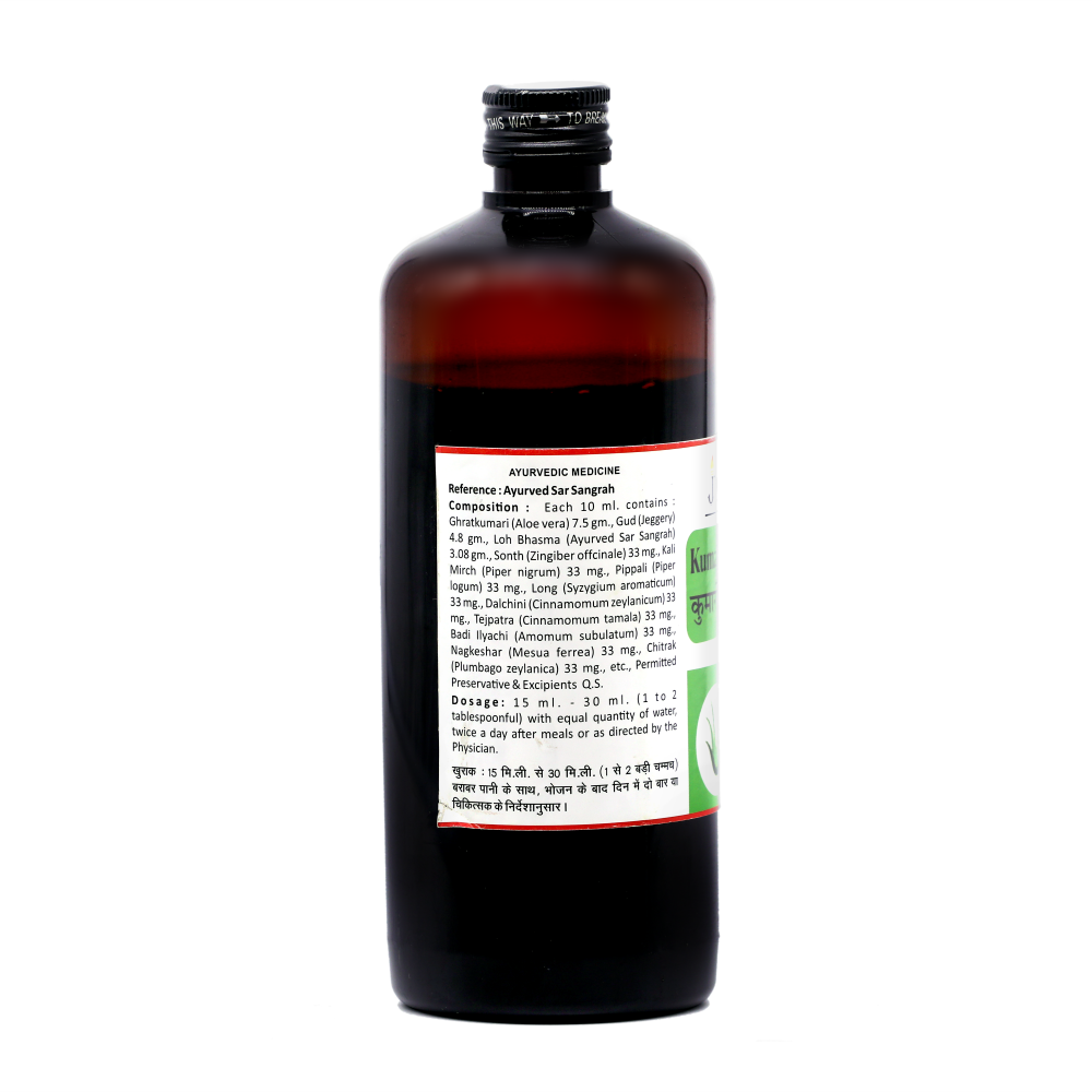 Each 10 ml. contains : Ghratkumari (Aloe vera) 7.5 gm., Gud (Jeggery) 4.8 gm., Loh Bhasma (Ayurved Sar Sangrah) 3.08 gm., Sonth (Zingiber officinale) 33 mg., Kali Mirch (Piper nigrum) 33 mg., Pippali (Piper logum) 33 mg., Long (Syzygium aromaticum) 33 mg., Dalchini (Cinnamomum zeylanicum) 33 mg., Tejpatra (Cinnamomum tamala) 33 mg., Badi Ilyachi (Amomum subulatum) 33 mg., Nagkeshar (Mesua ferrea) 33 mg., Chitrak (Plumbago zeylanica) 33 mg., Pipramool (Piper Longum) 33 mg., Vaividang (Embelia ribes) 33 mg., Gajpipal (Scindapsus officinalis) 33 mg., Chavya (Piper chaba) 33 mg., Hauver (Juniperus communis) 33 mg., Dhaniya (Coriandrum sativum) 33 mg., Kutki (Picrorhiza kurroa) 33 mg., Supari (Areca catechu) 33 mg., Nagarmotha (Cyperus rotundus) 33 mg., Harad (Terminalia chebula) 33 mg., Baheda (Terminalia bellirica) 33 mg., Aavla (Emblica officinalis) 33 mg., Rasna (Pluchea lanceolata) 33 mg., Devdaru (Cedrus deodara) 33 mg., Haldi (Curcuma longa) 33 mg., Daruharidra (Berberis aristata) 33 mg., Murva (Marsdenia tenacissima) 33 mg., Munakka (Vitis vinifera) 33 mg., Dantimul (Baliospermum montanum ) 33 mg., Pushkarmool (Inula racemosa) 33 mg., Bala (Sida cordifolia) 33 mg., Atibala (Abutilon indicum) 33 mg., Beej Konch (Mucuna pruriens) 33 mg., Gokhru (Tribulus terrestris) 33 mg., Hingupatri (Gardenia gummifera) 33 mg., Sonf (Foeniculum vulgare) 33 mg., Akarkara (Anacyclus pyrethrum) 33 mg., Beej Utangan (Blepharis edulis) 33 mg., Swet Punarnava (Trianthema portulacastrum) 33 mg., Punarnava Lal (Boerhavia diffusa) 33 mg., Lodhra (Symplocos recemosa) 33 mg., Swarna Makshik Bhasma (Ayurved Sar Sangrah) 33 mg., Dhai Fool (Woodfordia Fruticosa) 352 mg., Permitted Preservative & Excipients Q.S..