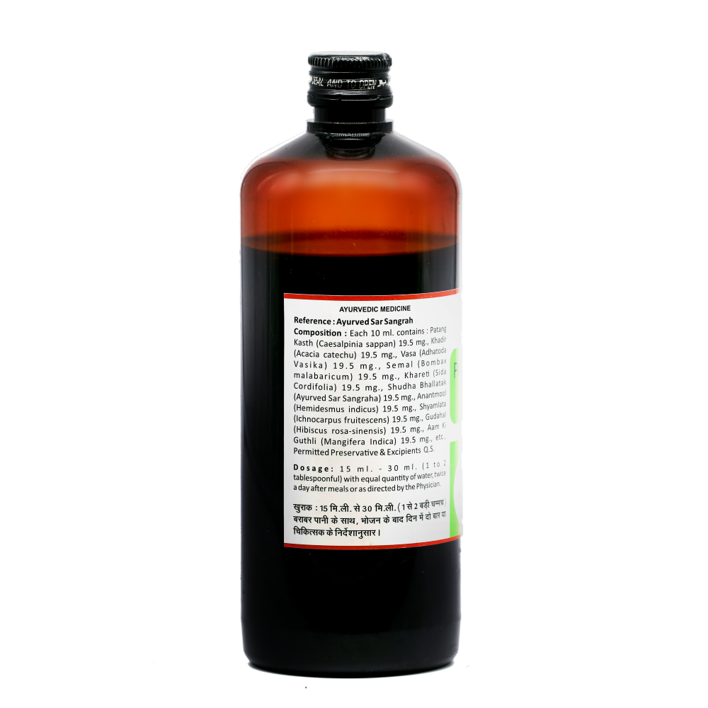 Each 10 ml. contains : Patang Kasth (Caesalpinia sappan) 19.5 mg., Khadir (Acacia catechu) 19.5 mg., Vasa (Adhatoda Vasika) 19.5 mg., Semal (Bombax malabaricum) 19.5 mg., Khareti (Sida Cordifolia) 19.5 mg., Shudha Bhallatak (Ayurved Sar Sangraha) 19.5 mg., Anantmool (Hemidesmus indicus) 19.5 mg., Shyamlata (Ichnocarpus fruitescens) 19.5 mg., Gudahal (Hibiscus rosa-sinensis) 19.5 mg., Aam Ki Guthli (Mangifera Indica) 19.5 mg., Daruharidra (Beberis aristata) 19.5 mg., Chirayta (Swertia chirayata) 19.5 mg., Jeera (Cuminum cyminum) 19.5 mg., Loh Bhasma (Ayurved Sar Sangraha) 19.5 mg., Rasaut (Bhav Prakash Nighantu) 19.5 mg., Belgiri (Aegle marmelos) 19.5 mg., Bhringraj (Eclipta alba) 19.5 mg., Dalchini (Cinnamomum zeylanicum) 19.5 mg., Kesar (Crocus sativus) 19.5 mg., Long (Syzygium aromaticum) 19.5 mg., Munakka (Vitis vinifera) 390 mg., Dhai Fool (Woodfordia Fruticosa) 312 mg., Sharkara (Cane Sugar) 1.95 gm. Gud (Jeggery) 0.98 gm., Permitted Preservative & Excipients Q.S..