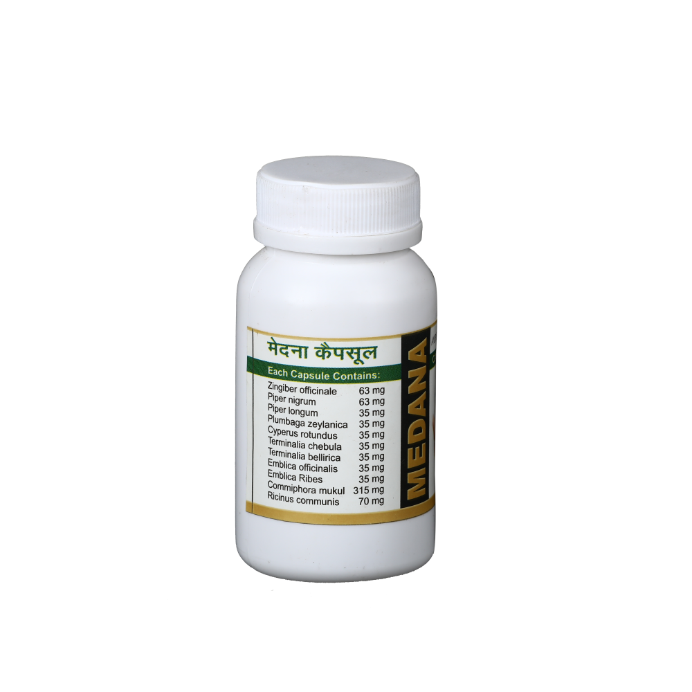 Zingiber officinale 63 mg. Piper nigrum 63 mg. Piper longum 35 mg. Plumbago zeylanica 35 mg. Cyperus rotundus 35 mg. Temiņalia chebula 35 mg. Teminalia belirica 35 mg. Emblica officinalis 35 mg. Emblica Ribes 35 mg. Commiphora mukul 315 mg. Ricinus communis 70 mg. .